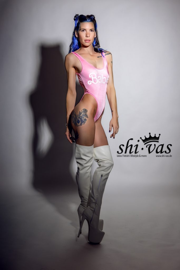 Aber hier geht es nicht um unsere Beziehung – oder besser: Nicht-Beziehung 😄 – hier geht es um die Fotos von diesem echt collen Body von SHEIN Germany. Der ist ja genau nach meinem Geschmack! Highcut … pink … mit einer Beschriftung auf der Brust: Babe! … und es geht um die geilen, weissen, oberschenkelhohen Stiefel, die mir ein Fan geschenkt hat!