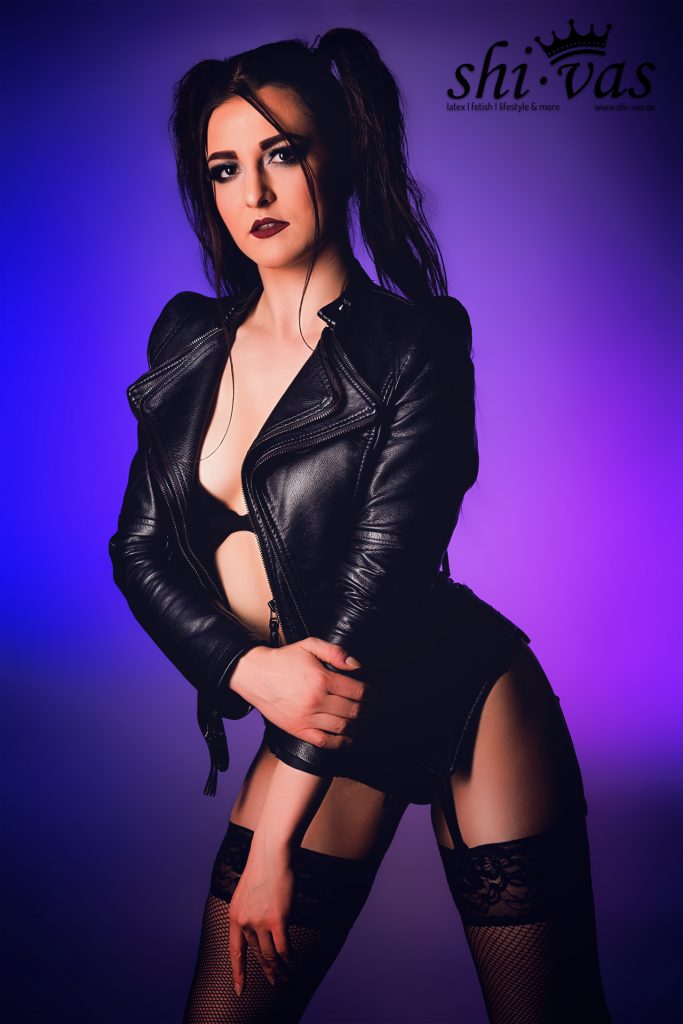Heute gibt es Lina mal in einem schwarzen Dessous-Set, kombiniert mit einer rockigen Leder-Bikerjacke. … und irgendwie passt das genau zu ihr, oder?