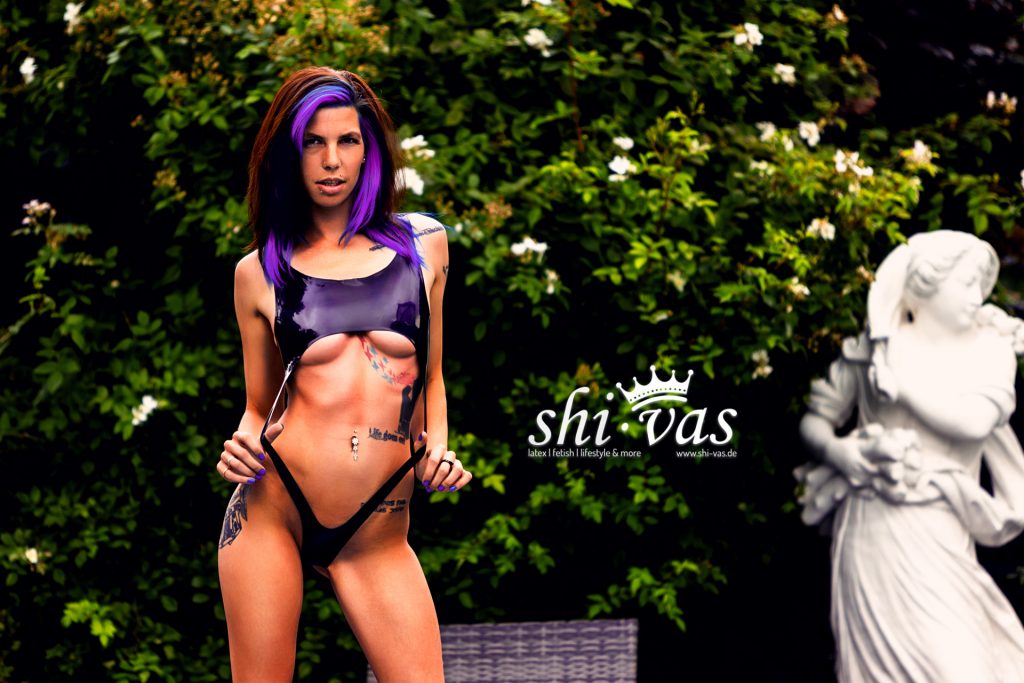 Latexswimwear hat hier nichts versteckt. Sie war präsent, glänzend, eindeutig. Und genau das macht diese Fotos so wirksam.