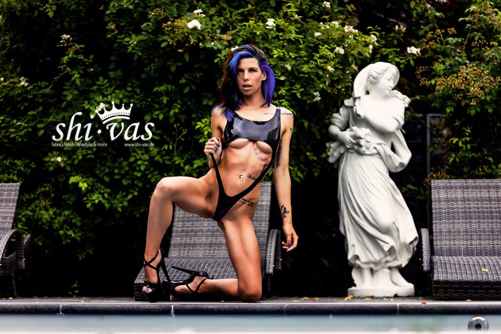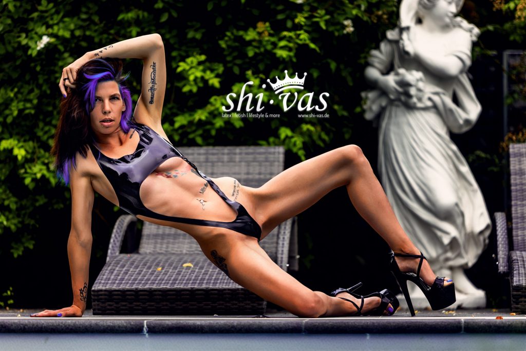Die Aufnahmen zeigen mich am Pool, in Latexswimwear, die sich im Licht abzeichnet und jede Bewegung sichtbar macht. Man sieht die Hitze, man spürt sie fast – dieses Gefühl zwischen Sommerluft und Wasser, das sofort hängen bleibt.