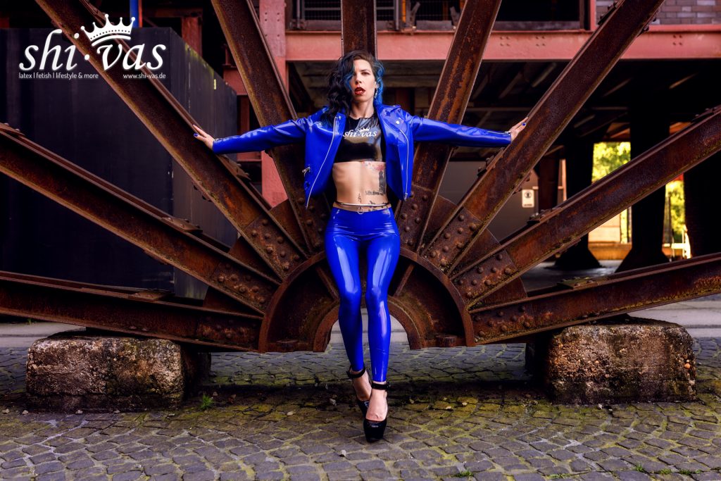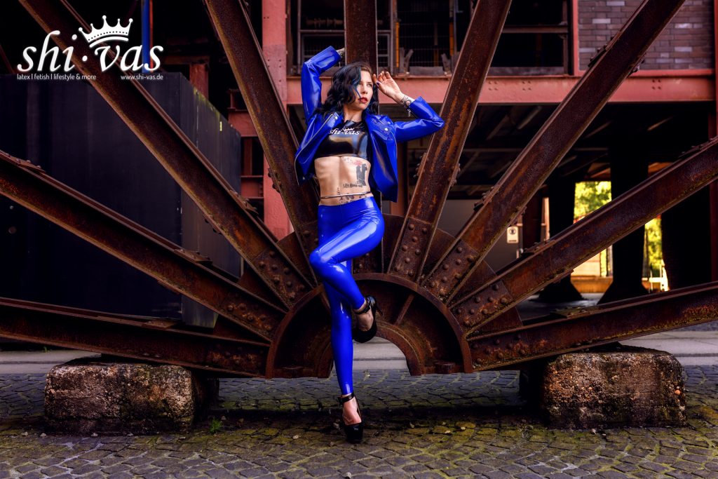Mein Outfit ist kein Zufall. Die Farbe knallt gegen das Braun des Stahls, gegen den rauen Boden, gegen all das Schwere hier. Das Blau ist kühl, aber mein Blick nicht. Die Jacke sitzt kurz, offen genug, um Luft an die Haut zu lassen. Darunter das Top. Eng. Ehrlich. Kein Stoff, der irgendetwas verstecken will. Die Leggings ziehen jede Linie nach, als hätten sie beschlossen, nichts zu verhandeln. Und genau das mag ich. 🔥💙