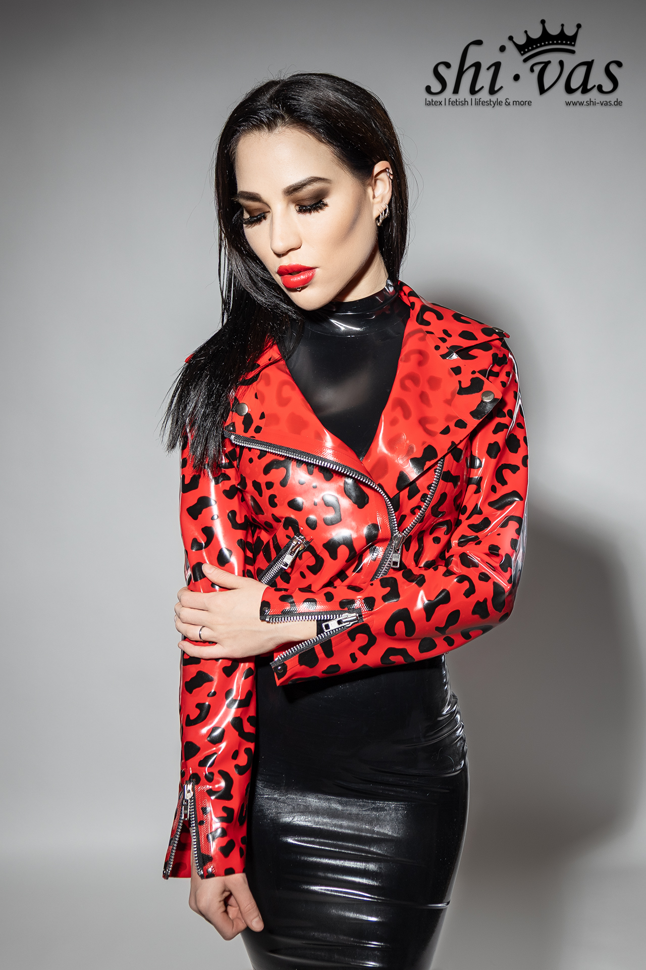 Amy trat ins Licht, und die Wirkung war unmittelbar. Die Jacke saß wie eine zweite Haut, was bei einem so komplexen Kleidungsstück aus Latex alles andere als selbstverständlich ist. Die Konstruktion der Revers, die präzise gesetzten Reißverschlüsse an den Ärmeln und dieses tiefrote, fast blutige Latex, auf das die schwarzen Flecken des Leo-Musters wie mit Tusche gezeichnet wirkten. Das Material hat eine ganz eigene Haptik; es ist fest genug, um die Form einer Bikerjacke zu halten, aber flexibel genug, um jede Kurve von Amys Körper zu betonen. Ich sah durch den Sucher und bemerkte, wie das Licht der Blitzköpfe auf den Schultern der Jacke tanzte. Jede Bewegung erzeugte neue Reflexionen, die das Muster fast dreidimensional erscheinen ließen.