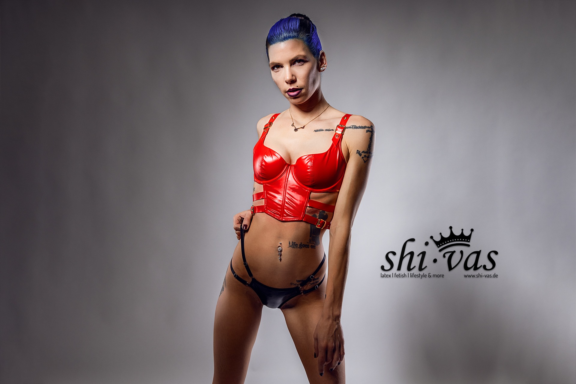 Das Kunstleder glänzt unter den Scheinwerfern wie flüssiges Blut. Es ist ein aggressives Material für eine aggressive Pose. Ich fordere dich heraus, wegzusehen. Aber wir wissen beide, dass du es nicht tun wirst. Du willst wissen, wie weit ich gehe. Du willst spüren, wie die Grenzen zwischen Model und Betrachter verschwimmen. Ich bin das Objekt deiner Begierde, aber ich bin gleichzeitig die Herrin über die Situation. Ein Paradoxon in Signalrot.