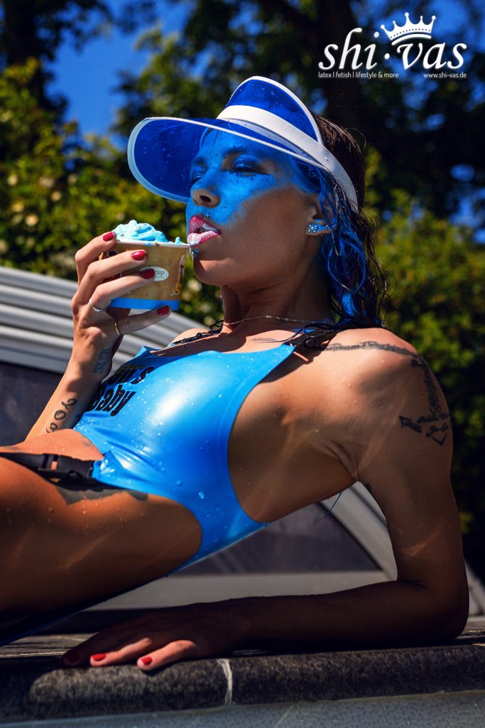 Aber der Knüller ist und bleibt halt der Latex-Swimsuit, den Miss Grey Latexfashion für uns gemacht hat. ❤️ Der ist einfach nur megageil! Schön knapp und sexy … und üfr mich als Girl der Neunziger natürlich genau mit dem richtigen Spruch auf der Brust: 90’s baby!