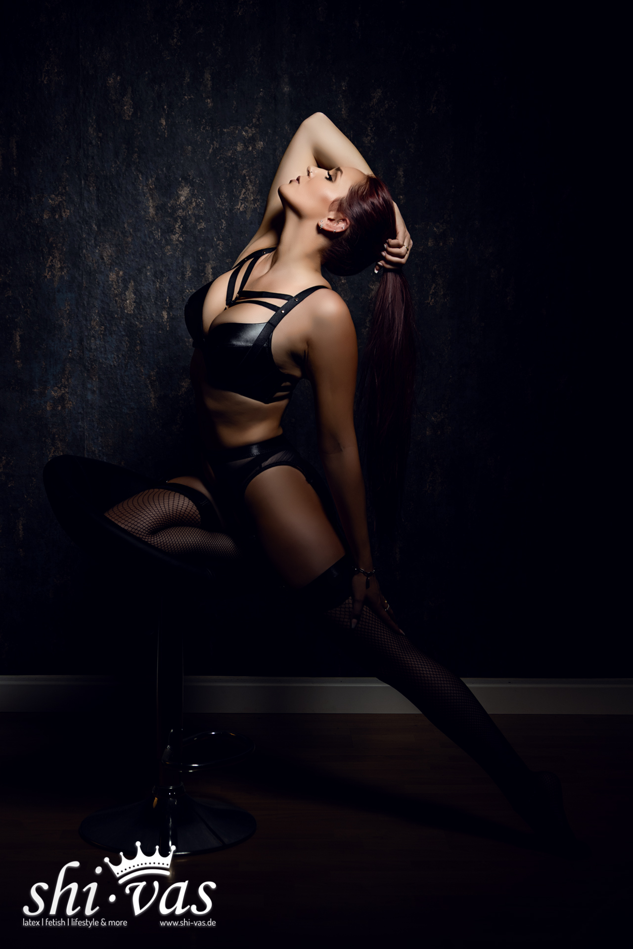 Als sie sich das erste Mal auf den Hocker setzt und die Beine anzieht, wird das Kopfkino sofort getriggert. Man sieht die Spannung in ihren Waden, das Spiel der Muskeln unter den Netzstrümpfen. Das Licht fängt sich auf dem glatten Schwarz des Tops, das ihre Brust so knapp umschließt, dass jeder Atemzug die Riemen an ihre Belastungsgrenze zu führen scheint. Es ist ein Spiel mit dem Material – das weiche Fleisch, das von den harten Linien des Kunstleders sanft eingeschnürt wird. Ich fokussiere auf ihre Augen, doch die Kamera schweift fast von selbst ab zu den Details ihrer Taille, dort, wo die Strapse in das tiefe Schwarz des Höschens übergehen.