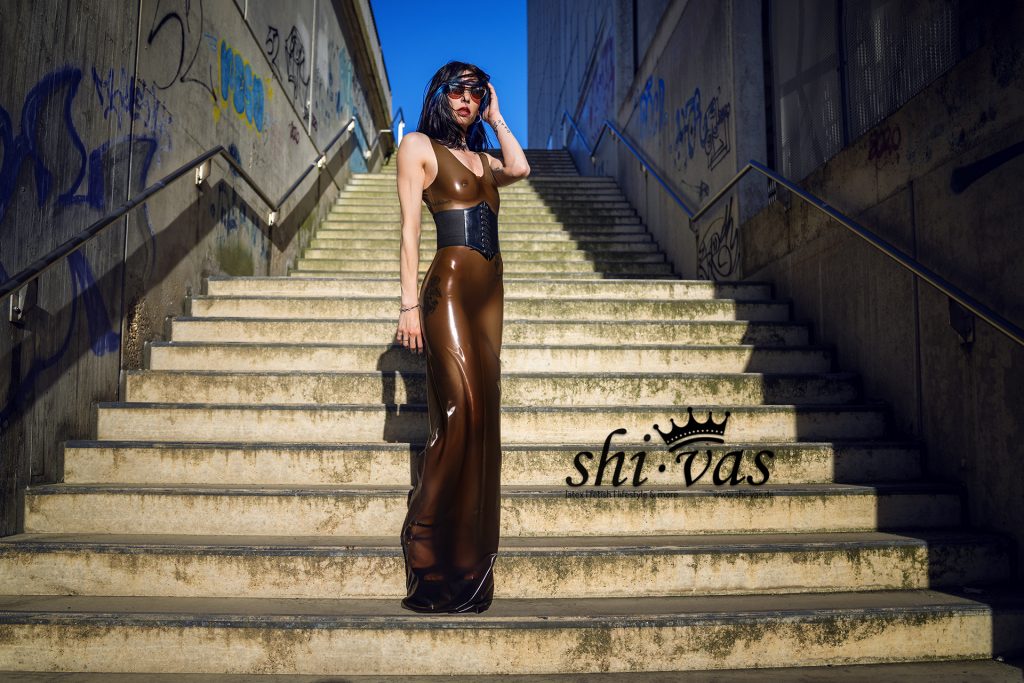 In diesem traumhaften Latex-Kleid auf dieser Treppe … da hat Micha eine echt geile Location ausgesucht, oder? Dazu passte das herrliche Wetter mit dem strahlend blauen Himmel. Der ganze Tag war einfach ein Traum.