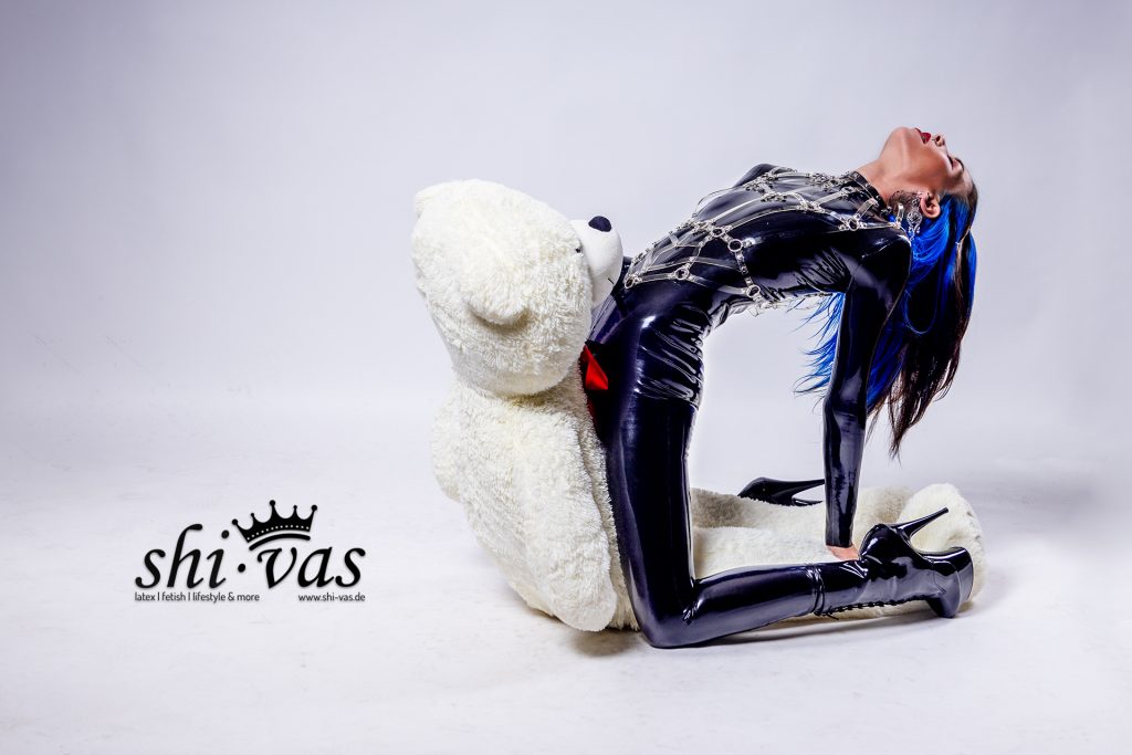 Zwei Dinge liebe ich ganz besonders: hautenges Latex … und meinen Teddy! 😍 Und wenn ich dann schon meinen schwarzen Latex-Catsuit von Bright & Shiny Latex anhabe UND meinen Teddy mit im Studio habe – was meint ihr wohl, was dann passiert?